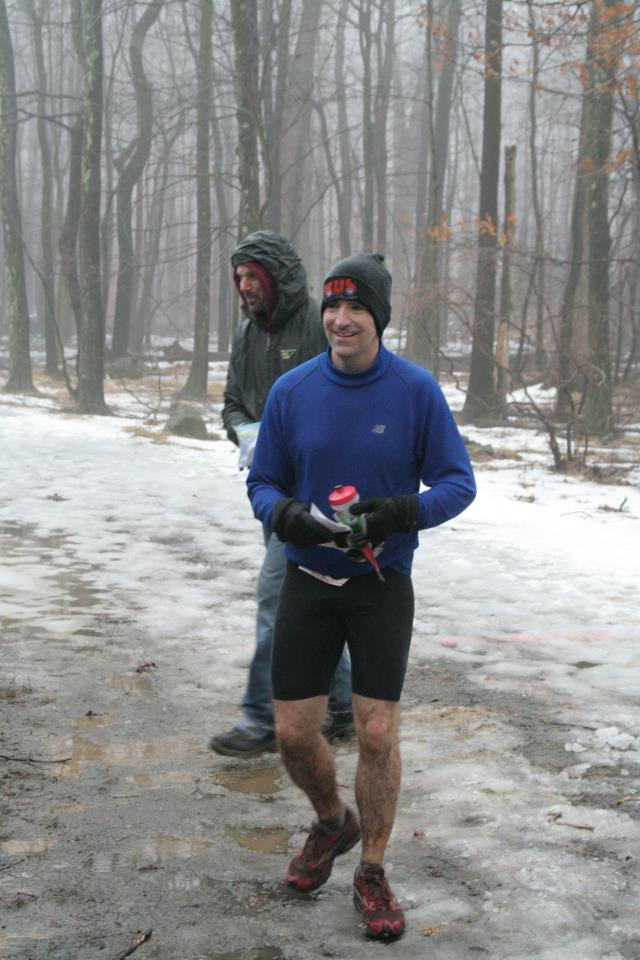 It's interesting to notice in a race like this how, one by one, certain parts of your body go numb. First your feet don't feel the wet or the cold or the pounding from the ragged rocks or stubbing your toes. Then the back and side muscle soreness dissipate. Eventually you don't even notice it when your feet slide out from under you. There was a constant drizzle/mist during the race - I could never feel it hit on my skin, I just know I was never getting any drier or warmer. I was soaked to the skin literally from my head to my toes, and at certain spots on the course where the temperature was a couple degrees cooler, I became worried about hypothermia, which is something that you can't put out of your head once it sets in. Halfway through the third lap this became a real concern, and I gave serious thought to stopping after three laps, and getting credit for a 50K. I was torn because this was a test for me, I didn't want this to be another drop out/drop down. On the other hand an extra 3 1/2 hours could be really bad. I was thinking, "OK, running in the ice and on the rocks and the mud might be fun for a 50K, but 50 miles? Who wants that? Am I miserable or am I happy?" (Actually, I really did love running in the mud.) Like I said to one runner I was chatting with about this time, what I want and what I want are two different things. But in the end the cold never really got any worse and as much as I tried, I couldn't find a legitimate excuse to stop at 50K. Plus, I got a boost of energy near the end of the lap, so I went on through.
